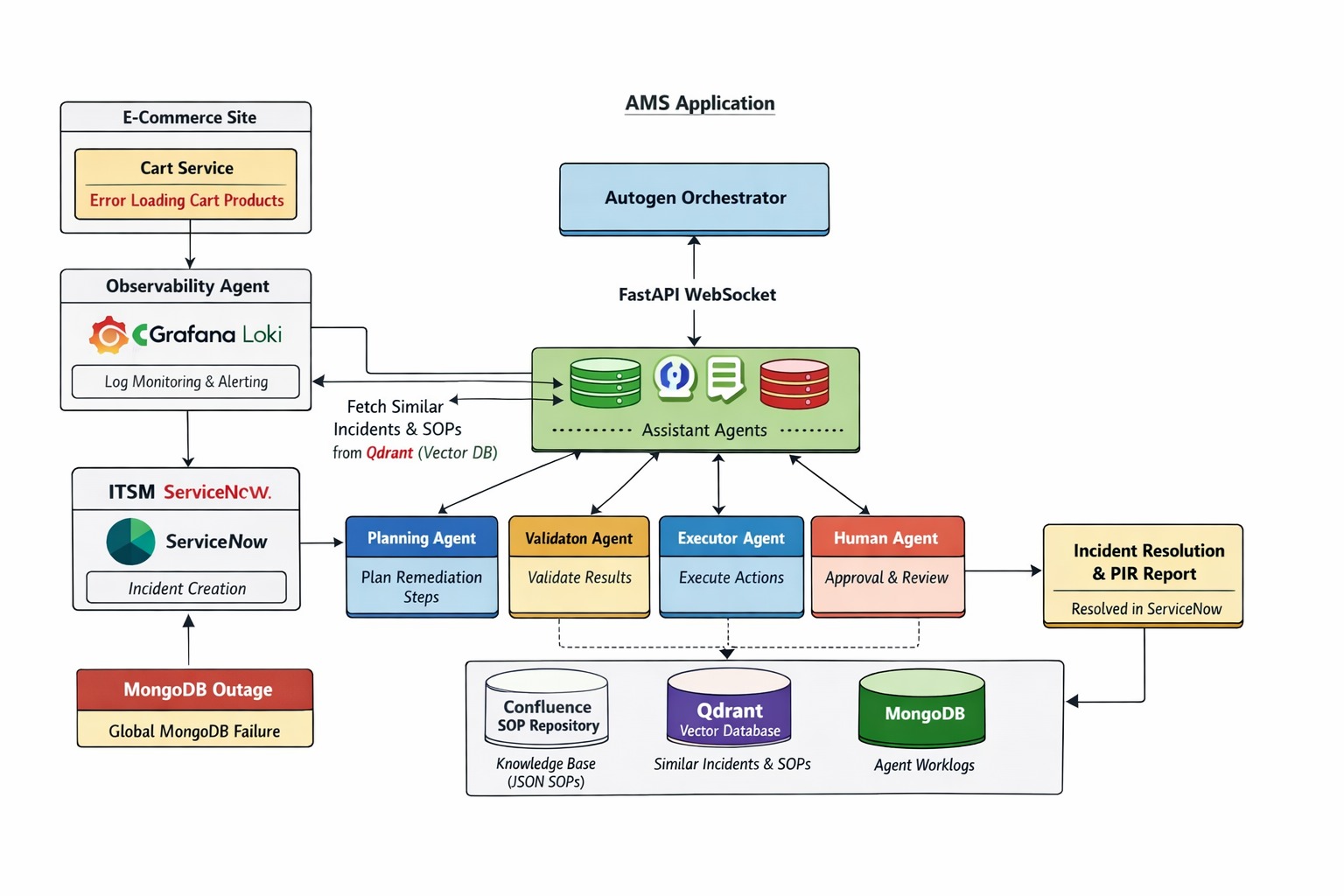 The Agentic AMS Framework was built as a sincere attempt to address this state of affairs. The ambition is precise: to construct a system that not only detects anomalies in a production environment, but reasons about them, retrieves the relevant remediation procedures from an organizational knowledge base, executes a remediation plan through real infrastructure tooling, and validates that the execution actually worked. All of this, with a human given every opportunity to intervene before anything irreversible occurs.